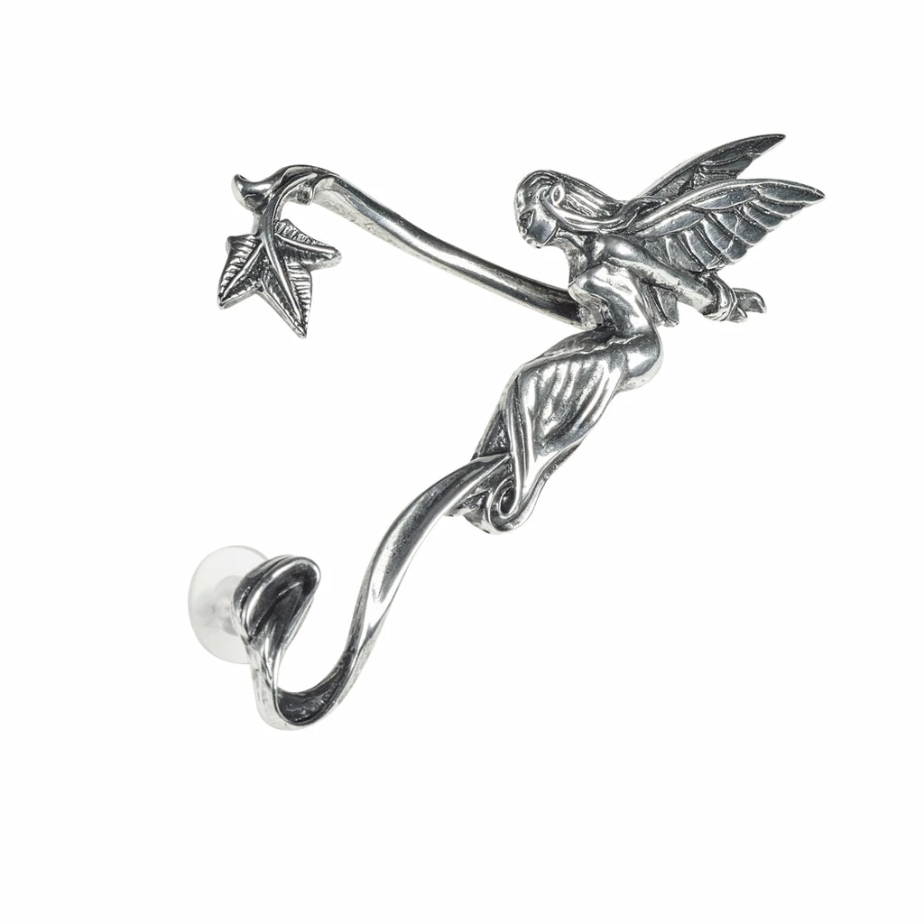 This polished, antiqued pewter ear-wrap of a fairy whispering into your ear, is supported by fine leafy scrolls – can be gently squeezed to comfortably fit your own profile; fastened at the lobe with one surgical steel ear-post