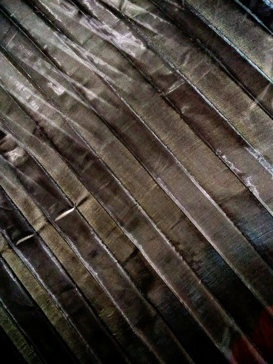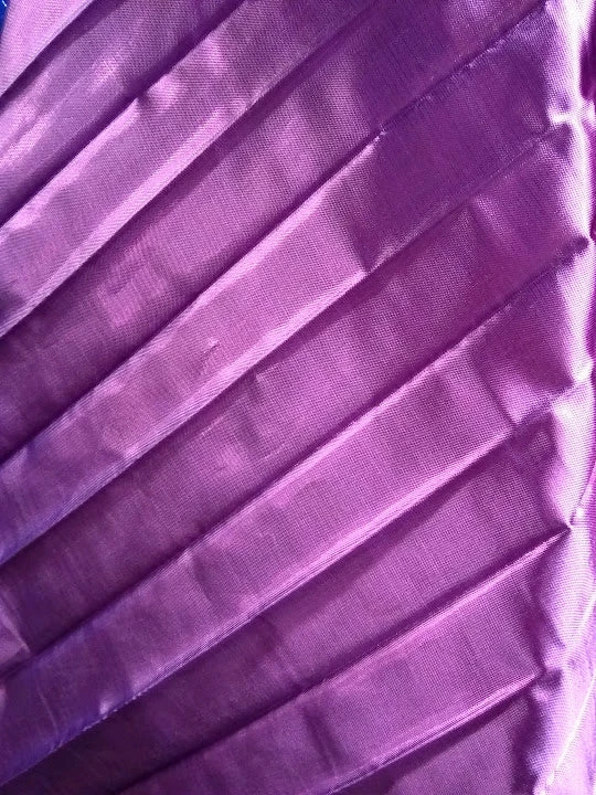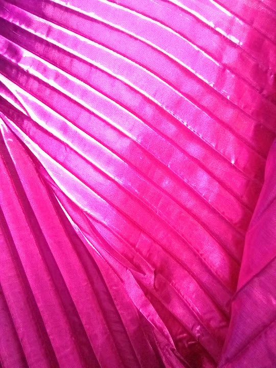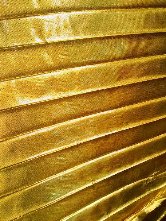 The wings are full circle, made of pleated lame. There is a pocket stitched at the bottom edges where a metal expandable rod can be inserted for the dancer to hold and manipulate the wings. Attached by an elastic and velcro band around the neck.