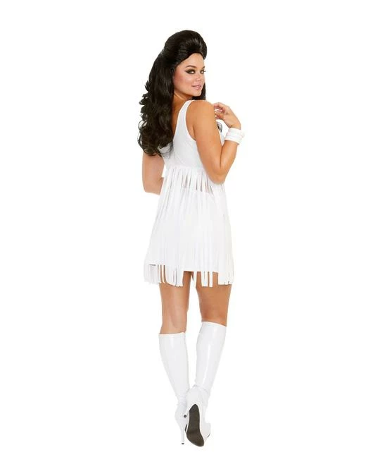 Iconic 60’s styled faux two piece fringe dress with mesh midriff inset. Includes white fringe dress & 3 white bangle bracelets.