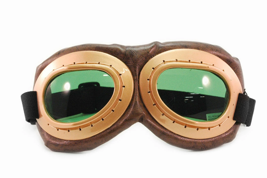 Featuring gold metallic plastic frames with brown faux-leather and foam eye padding, vintage green acrylic lenses, and stitched detailing, this aviation-ally awesome eyewear makes a great addition to your whimsical wardrobe or novelty dress-up collection.