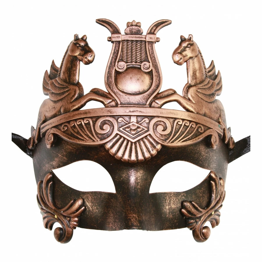 Gladiator style masquerade mask with horse and filigree adornment and ribbon ties to secure.