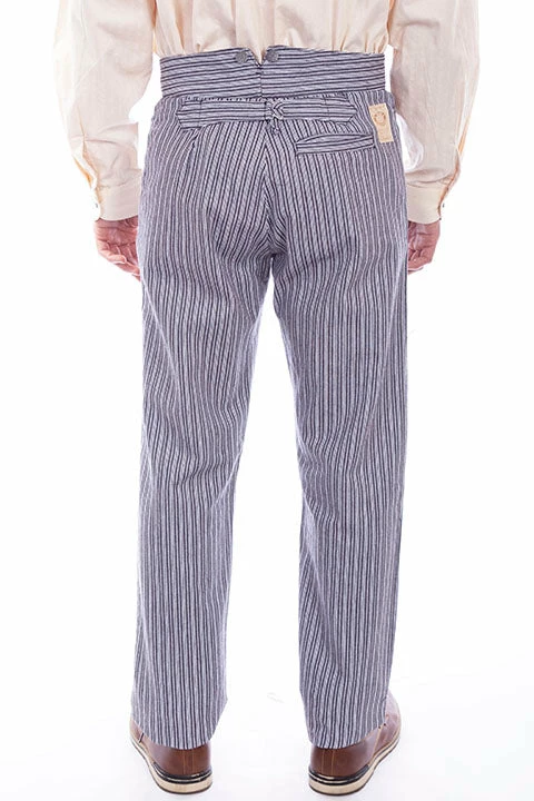 - These sturdy durable stripe pants feature a button fly, two riding pockets with a watch pocket and suspender buttons.
