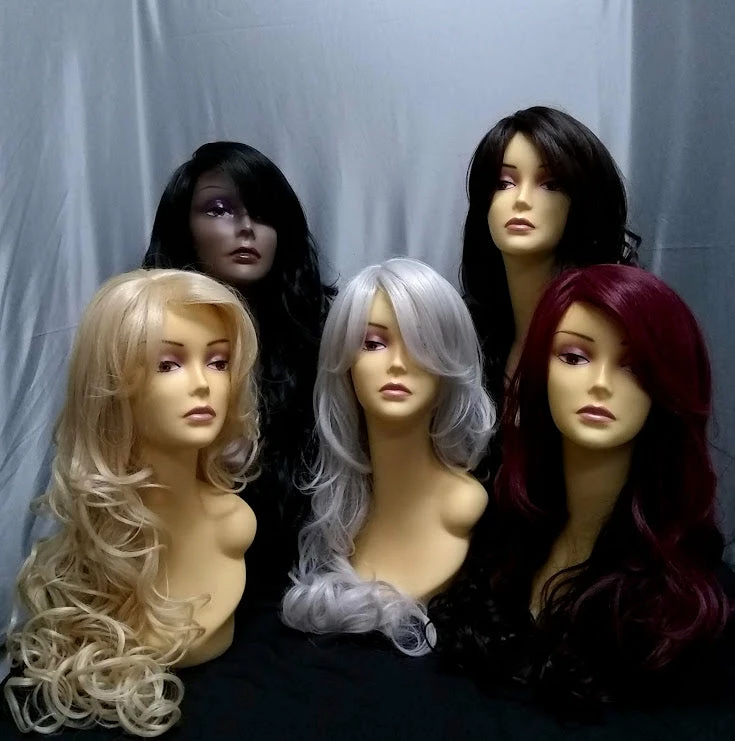 Curly layers from 6.25″ to 24.5″, heat resistant fibers. Colors: 1B Black, 4 Brown, White, 613 Blonde, DX4799 Maroon Multi, & Grey/60